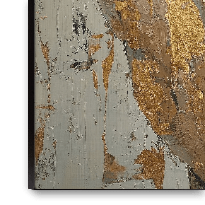 Gouden Stilte kan daarom worden gezien als een ode aan innerlijke kracht en onuitgesproken verhalen. Het werk nodigt de toeschouwer uit om langer te kijken, om de nuances van licht, textuur en emotie te ontdekken, en om stil te staan bij de schoonheid die schuilt in rust, reflectie en menselijke complexiteit. Modern Abstract.