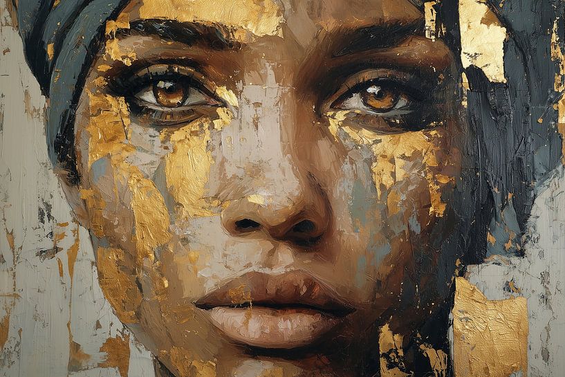 Daarnaast verwijst het goud historisch en cultureel naar heiligheid, spiritualiteit en tijdloosheid. In religieuze iconografie werd goud vaak gebruikt om het goddelijke en het eeuwige te verbeelden. In deze afbeelding krijgt het goud een meer menselijke en emotionele betekenis. Het verheft het portret tot iets universeels, waarbij de persoon niet alleen een individu vertegenwoordigt, maar ook thema’s zoals identiteit, veerkracht en innerlijke waarde.