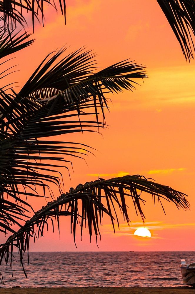 Silhouette d'amoureux dans un bateau avec palmier sur la plage au coucher du soleil à Negombo Sri Lanka