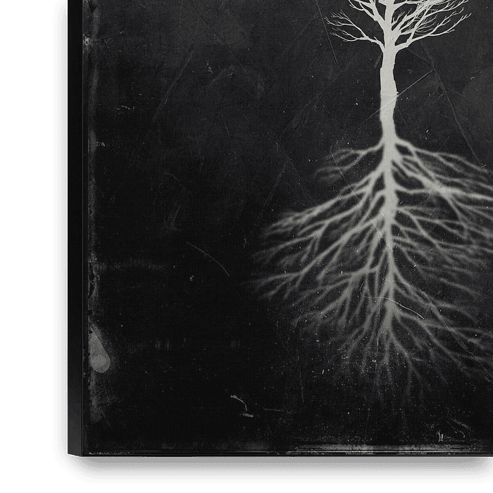 Illustration numérique d'un arbre sans feuillage avec son reflet sur un fond texturé noir.