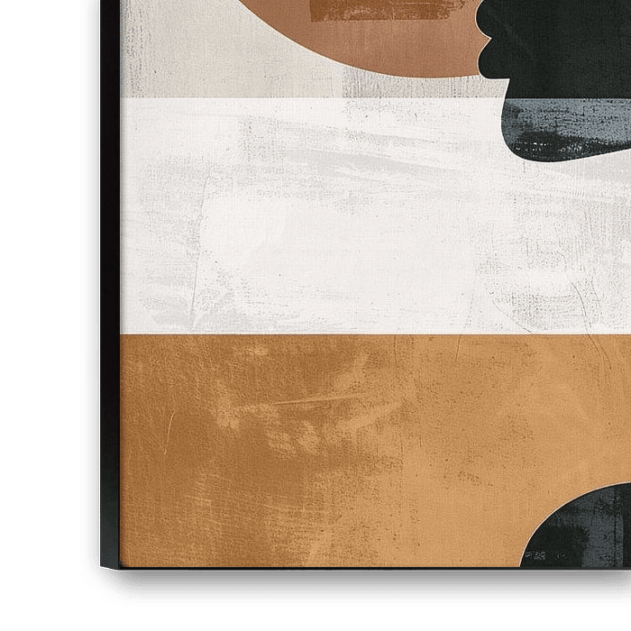 Ce design élégant se caractérise par l'utilisation de formes simples et d'une palette de couleurs calmes. Au centre se trouve la silhouette d'une femme, entourée de cercles qui ajoutent de la profondeur et de l'intérêt à la pièce. Les couleurs sont douces et terreuses, avec des nuances de beige, de gris et de brun, ce qui donne un aspect calme et élégant. Cette œuvre d'art s'intègre parfaitement dans un espace de vie ou un bureau moderne, où elle apporte une touche artistique subtile sans être trop imposante.