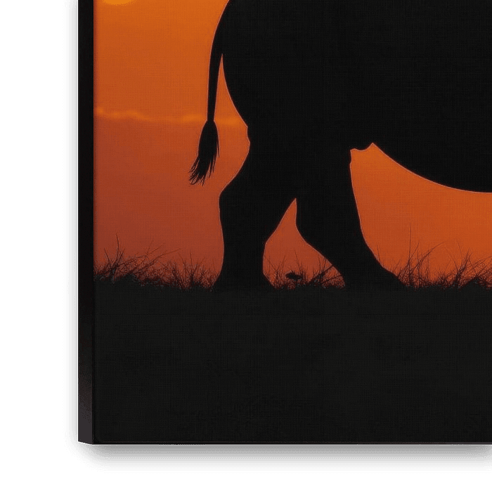 Silhouette d'un rhinocéros marchant dans une plaine herbeuse au coucher du soleil. Des oiseaux volent dans le ciel orange.