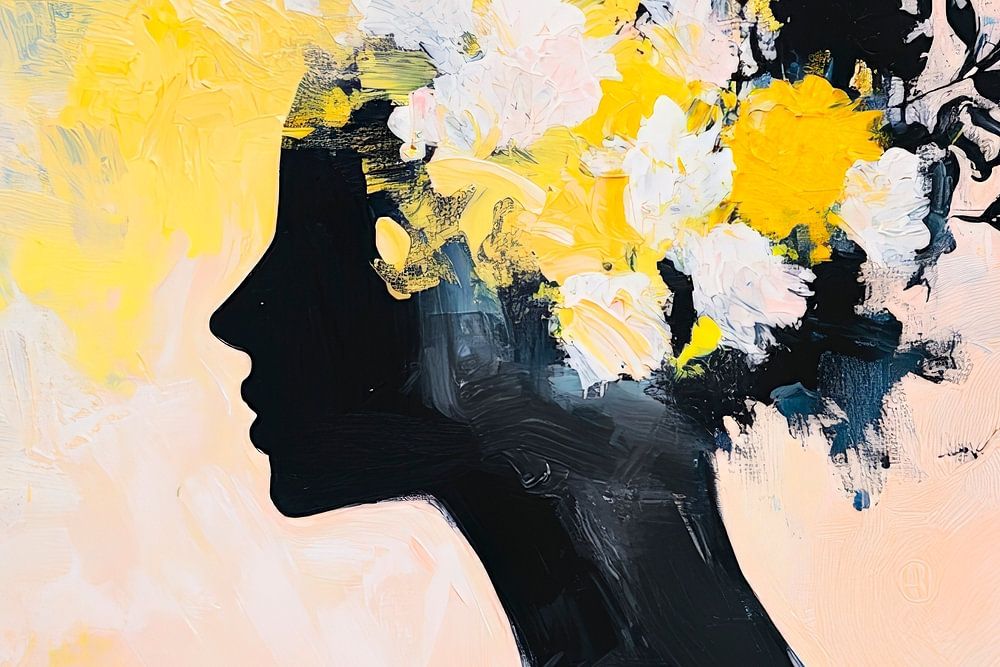 Une combinaison harmonieuse de silhouettes et d'accents floraux se déploie dans l'image, où le jaune lumineux et les fleurs douces développent le monde des pensées d'une âme créative. Cette composition inspirante apporte une énergie fraîche dans chaque salon et invite à la rêverie et à la réflexion. Parfait pour les esprits créatifs !