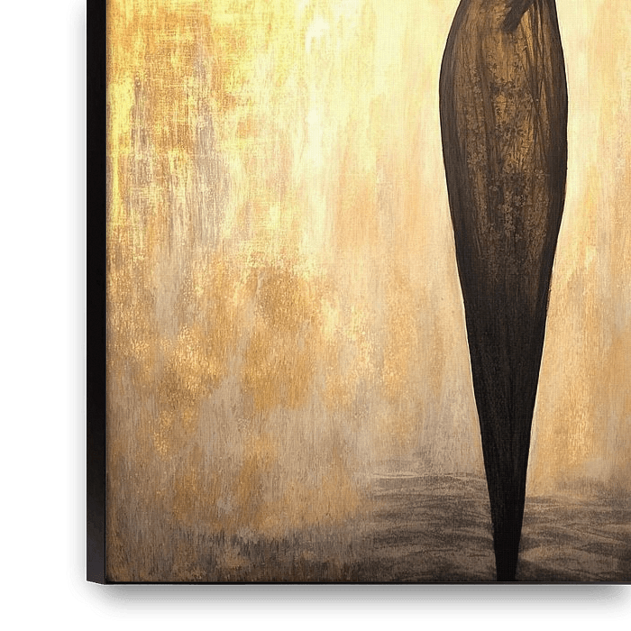Une grande silhouette féminine se dresse, fière et silencieuse, entourée de fleurs douces qui semblent s'élever comme des pensées. L'arrière-plan doré rayonne de chaleur et de tranquillité. Serene Silhouette est une ode à la force et à la vulnérabilité féminines, capturées avec simplicité. Une œuvre d'art silencieuse mais qui en dit…