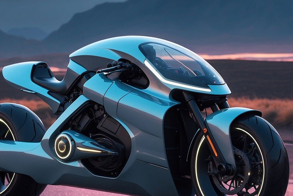 Étude conceptuelle d'une moto sur une route de campagne isolée pendant le coucher du soleil.