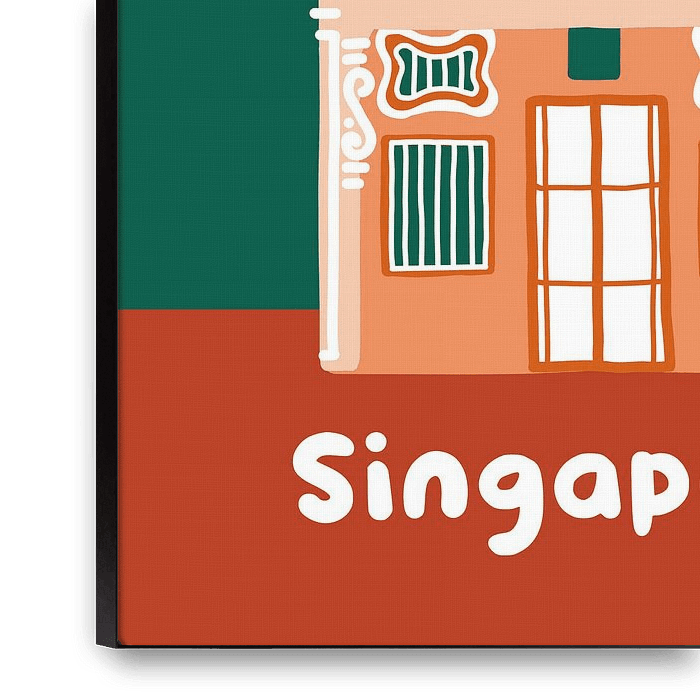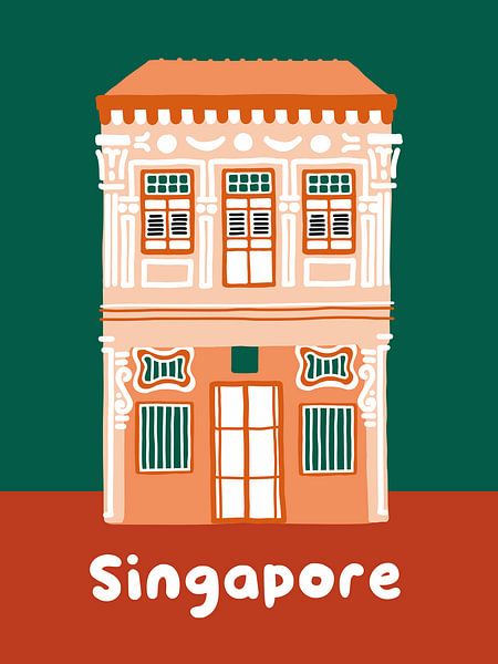 Cette illustration montre une maison Peranakan classique de Singapour, exécutée dans un style graphique avec des formes plates et des couleurs vives. Le design est net et moderne, avec un œil pour les détails architecturaux et les combinaisons de couleurs qui s'intègrent bien dans les intérieurs contemporains.