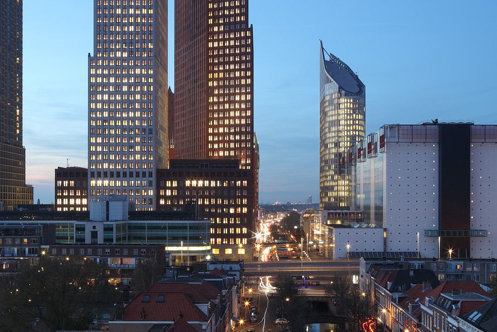 Skyline van De Haag met het voormalige en huidige Ministerie van Justitie en Binnenlandse Zaken, de Hoftoren, het voormalig Ministerie van VROM en Den Haag Centraal.