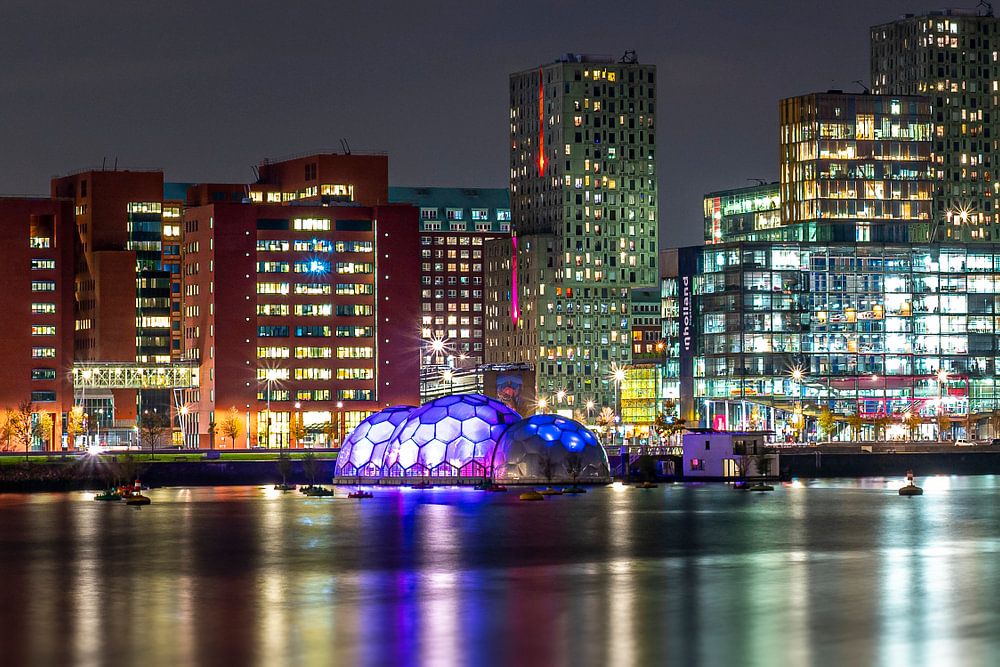 Le pavillon flottant est situé dans le Rotterdam Rijnhaven. Cette structure frappante est un complexe de trois hémisphères flottants.