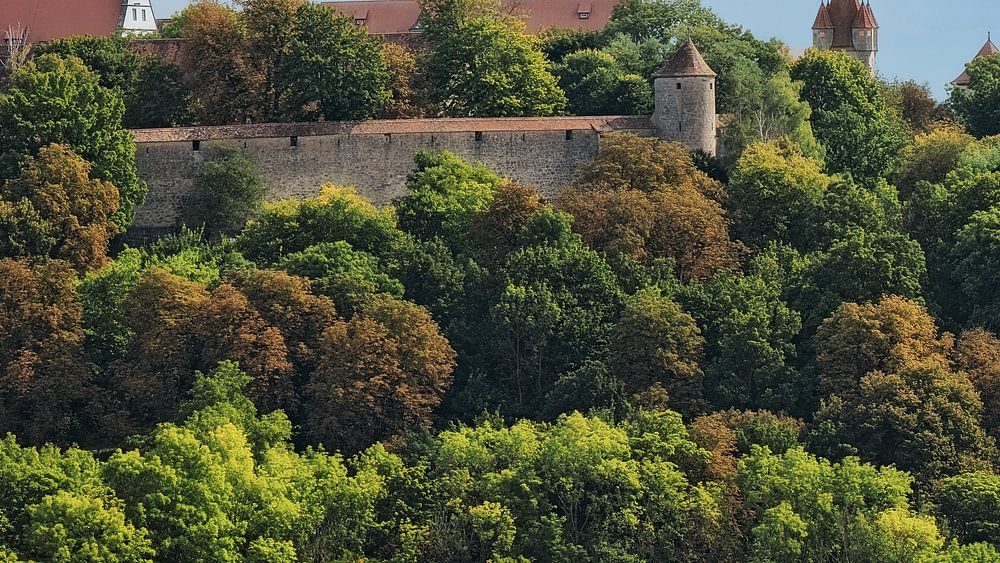 Une vue du mur d'enceinte de la ville fortifiée dans les couleurs automnales naissantes, qui donnent à l'image une palette dominée par le vert et le brun rougeâtre. C'est une belle image à regarder avec de nombreux détails qui ne ressortent pas au premier coup d'œil.