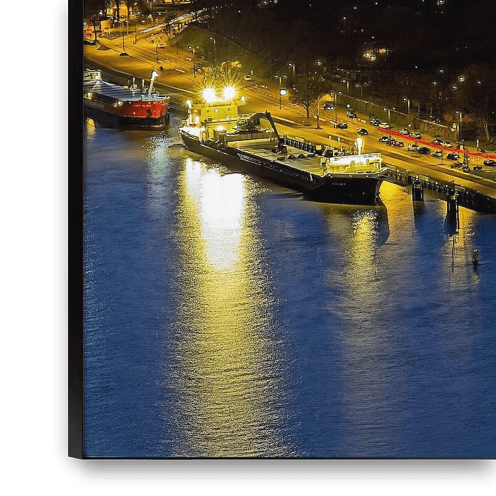 Cette photo a été prise à environ 130 mètres de hauteur, au sommet d'un immeuble de bureaux situé dans le quartier Kop van Zuid, par une soirée où le ciel était dégagé. À nos yeux, il fait déjà nuit noire, mais le ciel est ici teinté par la lumière du soleil qui persiste et par l'éclairage de la ville. La lueur rouge dans le ciel est le…