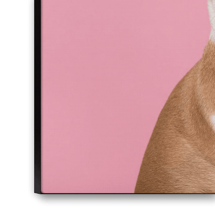 Portret van een oud engelse bulldog met een enorme lach tegen een roze achtergrond
