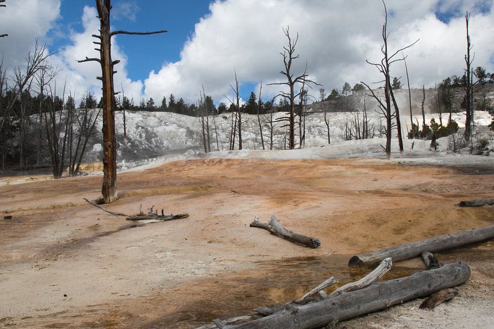 Fascinerende kleuren van een zwavelbron in Yellowstone met oude verdorde bomen.