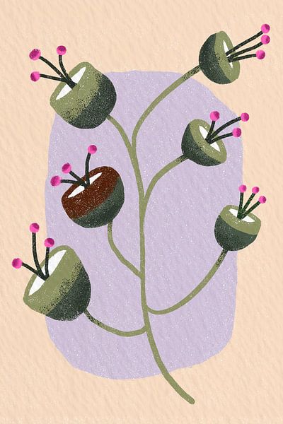 Dans cette œuvre se déploie une branche ludique aux formes organiques qui rappellent des baies ou des capsules. Les douces nuances de vert sont associées à de subtiles touches de rose. La surface lilas en arrière-plan apporte calme et équilibre à la composition.