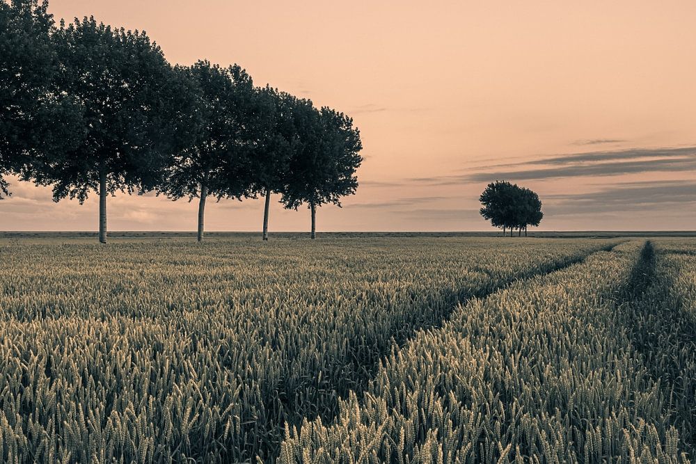 Une soirée d'été avec des champs de céréales et des arbres solitaires dans le polder de Johannes Kerkhoven. Près du hameau de Dallingeweer, les villages de Termunten, Woldendorp et Termunterzijl, à l'extrême nord de la province de Groningue, située contre le Dollard au nord-est des Pays-Bas.
