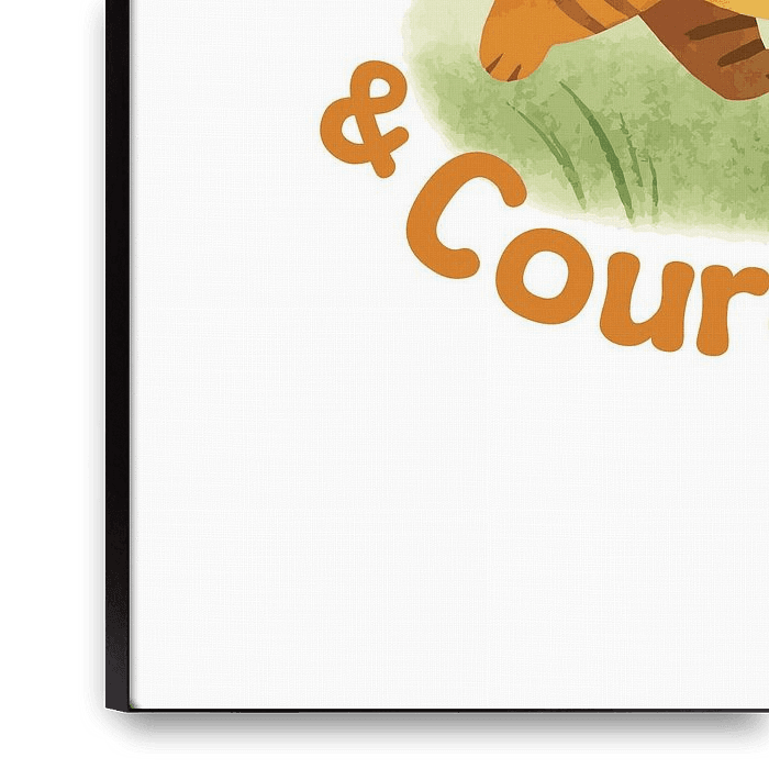 Cette œuvre d'art représente un joyeux tigré aquarellé marchant avec confiance sur une herbe verte et tendre, entouré des mots encourageants de Josué 1:9 : "Soyez forts et courageux". Le petit tigre est peint dans des tons chauds d'orange et de brun, avec de légers coups de pinceau qui mettent en valeur son expression enjouée. La…