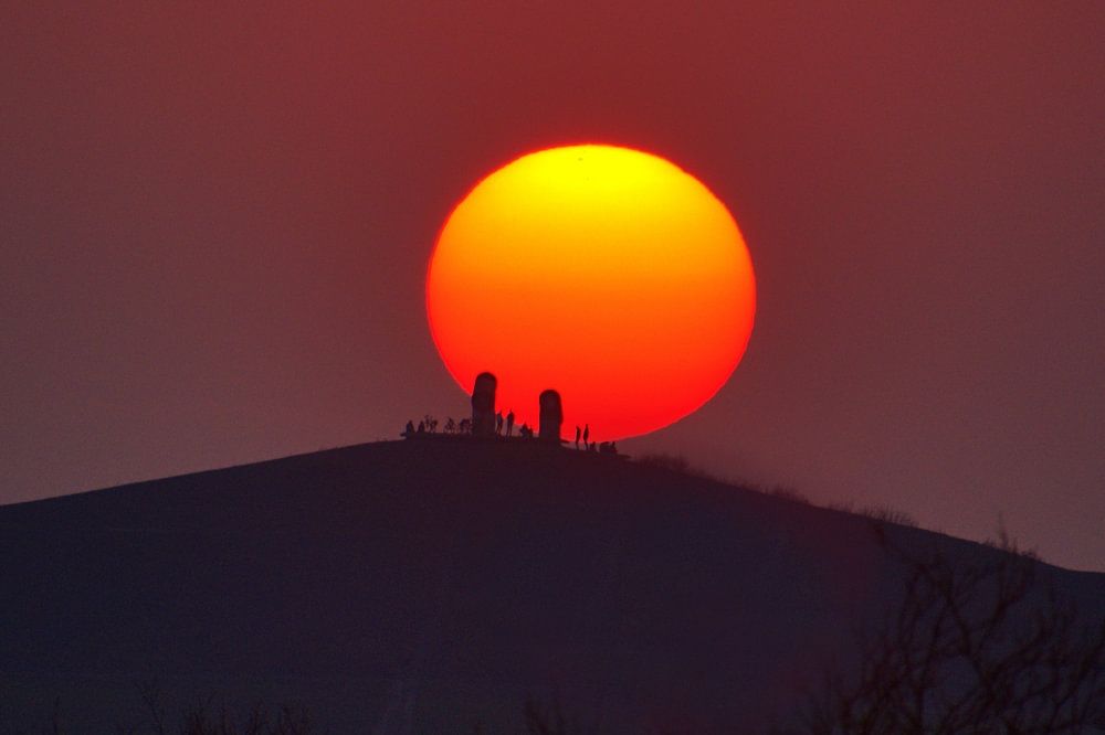 Deux fois par an, le soleil se couche juste au-dessus du sommet du terril de Rungenberg à Gelsenkirchen. Une fois au printemps et une fois en hiver. À contre-jour, on reconnaît les personnes sur le plateau du sommet grâce aux deux canons à lumière qui servent de repères.