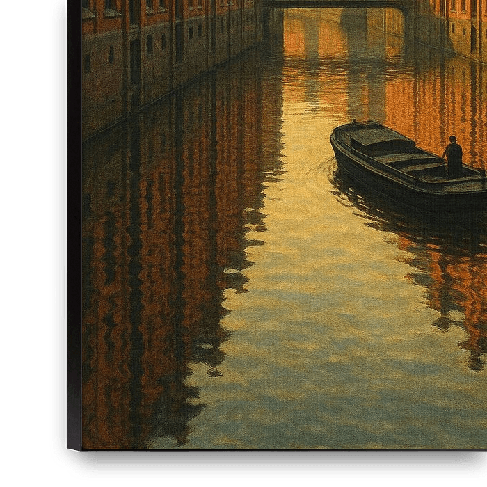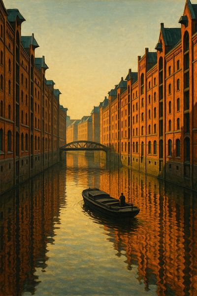 Cette peinture envoûtante vous transporte au cœur de la Speicherstadt de Hambourg, le plus grand quartier d'entrepôts au monde, classé au patrimoine mondial de l'UNESCO. L'œuvre capture la verticalité et le rythme architectural des bâtiments néogothiques en briques rouges qui bordent le canal étroit. La scène est baignée par la lumière…