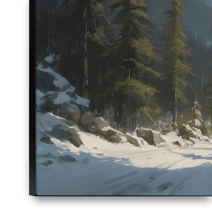 Peinture représentant une vue à couper le souffle d'un pic montagneux enneigé entouré de pins verdoyants et d'un paysage serein et enneigé baigné par la douce lumière du soleil.