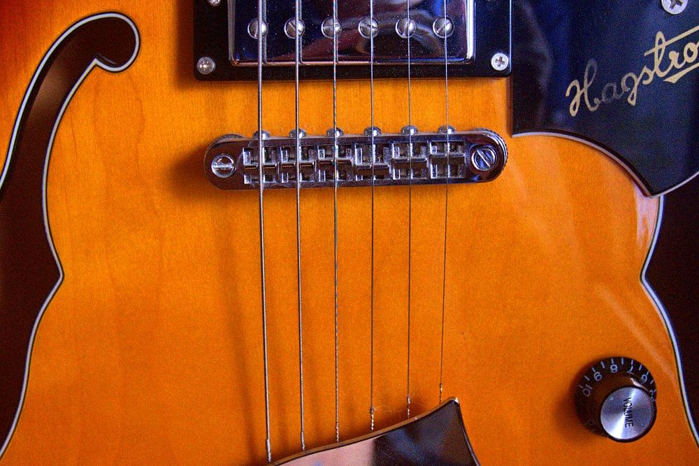 Photocollage d'une guitare avec une photo de coucher de soleil