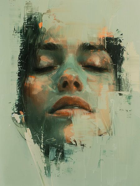 Portrait rêveur et éthéré dans lequel un visage féminin semble se dissoudre lentement dans de larges coups de pinceau expressifs. Les yeux sont fermés, ce qui évoque une atmosphère d'introspection et d'abandon. Le visage est constitué de couches transparentes dans des tons doux de vert, de menthe et de peau grisonnante, entrecoupées…