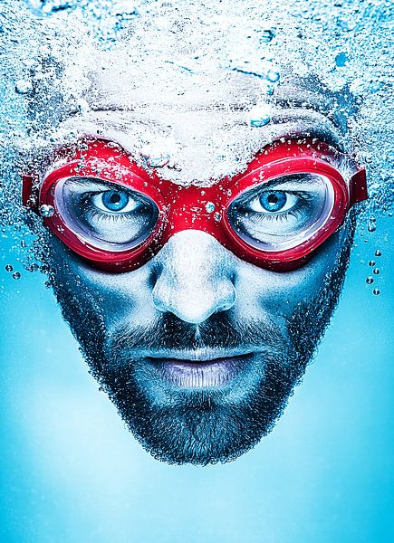 Cette œuvre vous arrête net dans votre élan. Un homme, face à l'objectif, à demi immergé dans une eau scintillante — le regard calme, presque provocateur. Ses lunettes de plongée rouges le rendent à la fois vulnérable et courageux.