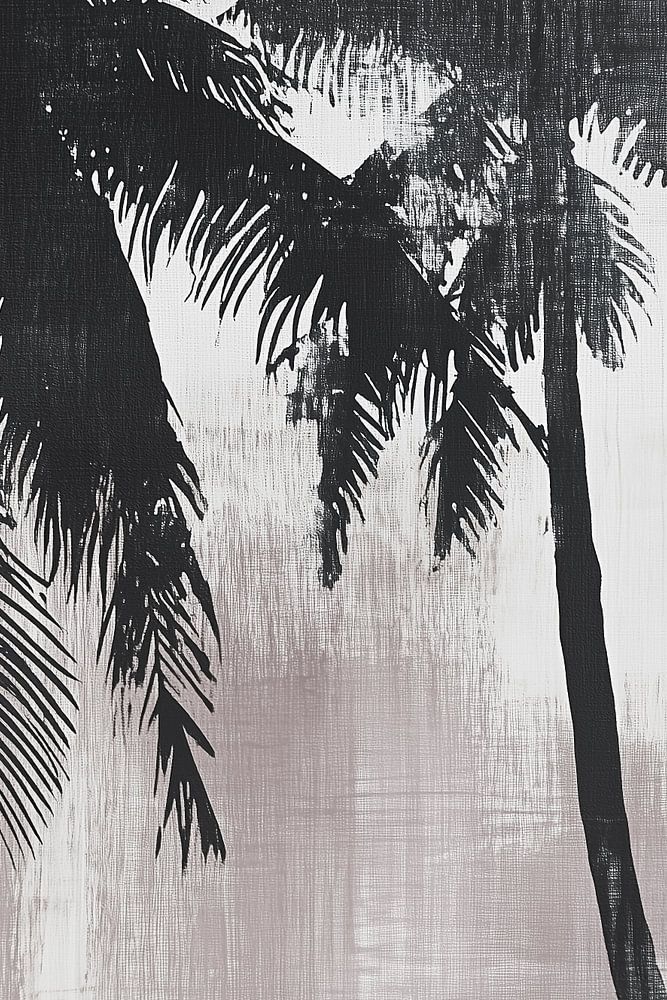 Deux palmiers tropicaux en noir, sculptés en silhouettes sombres sur un fond blanc-beige doux comme du lin. Les palmiers se dressent fièrement et élégamment, leurs longues feuilles plumeuses s'étirant vers le ciel, leurs formes distinctives étant clairement visibles dans l'ombre. La peau noire et sombre des troncs contraste agréablement avec les tons clairs et apaisants de l'arrière-plan.