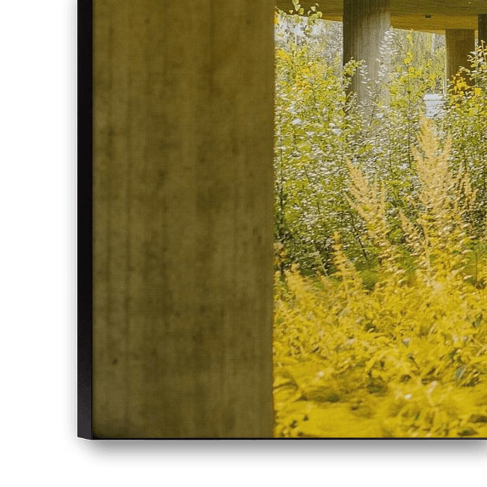 Sous un viaduc : rangées de piliers, verdure sauvage et touches de graffiti baignées de lumière dorée. Art mural contemporain pour maison ou bureau.