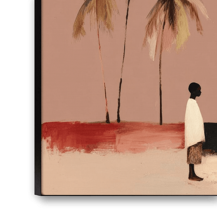 Une scène tropicale minimaliste représentant une silhouette sous de grands palmiers qui se balancent. Les tons chauds de sable et de rouille, associés au rose tendre du ciel, créent une atmosphère de vacances sereine. Une œuvre d'art intemporelle qui apporte paix et chaleur à tout intérieur.