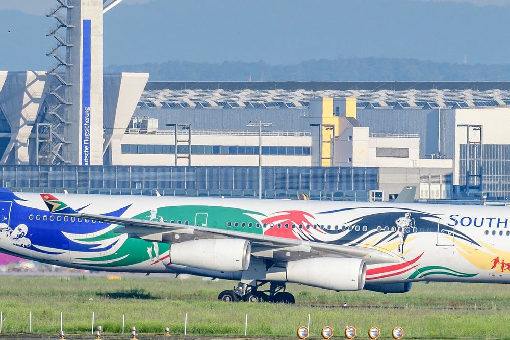 Un Airbus A340-300 coloré de la compagnie South African Airways juste après son atterrissage en route vers le terminal de l'aéroport de Francfort-sur-le-Main.