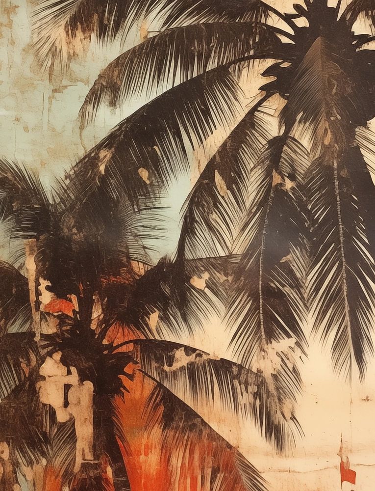 Photo d'une peinture murale vintage : des palmiers sur un fond de texture et de couleur. Un mur usé par les intempéries porte une palette de tons orange chauds et bleus froids qui, ensemble, créent une ambiance subtile mais expressive. Les palmiers se dressent fièrement au centre, leurs silhouettes formant un fort contraste avec l'arrière-plan et apportant une dynamique naturelle à l'image.
