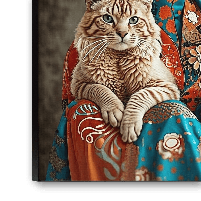 Son visage est calme et attentif, ses yeux clairs et légèrement pensifs. Elle tient son chat bien-aimé sur ses genoux, ce qui donne un sentiment de sécurité et de proximité familière. L'ambiance du tableau est chaleureuse, sereine et en même temps un peu mystérieuse. Dans ses pensées, elle semble s'attarder sur un souvenir silencieux ou une décision importante.