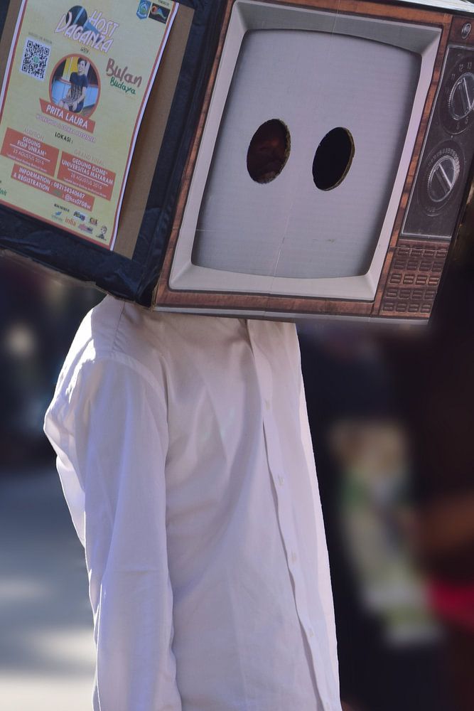 Un homme déguisé en téléviseur avec de la publicité dans une rue bondée de Mataram, la capitale de Lombok, en Indonésie. Je ne sais pas pourquoi il a une télévision sur la tête, mais je trouve que cela a l'air impressionnant. Tout le monde a un jour où l'on préfère ne pas se montrer, non ?