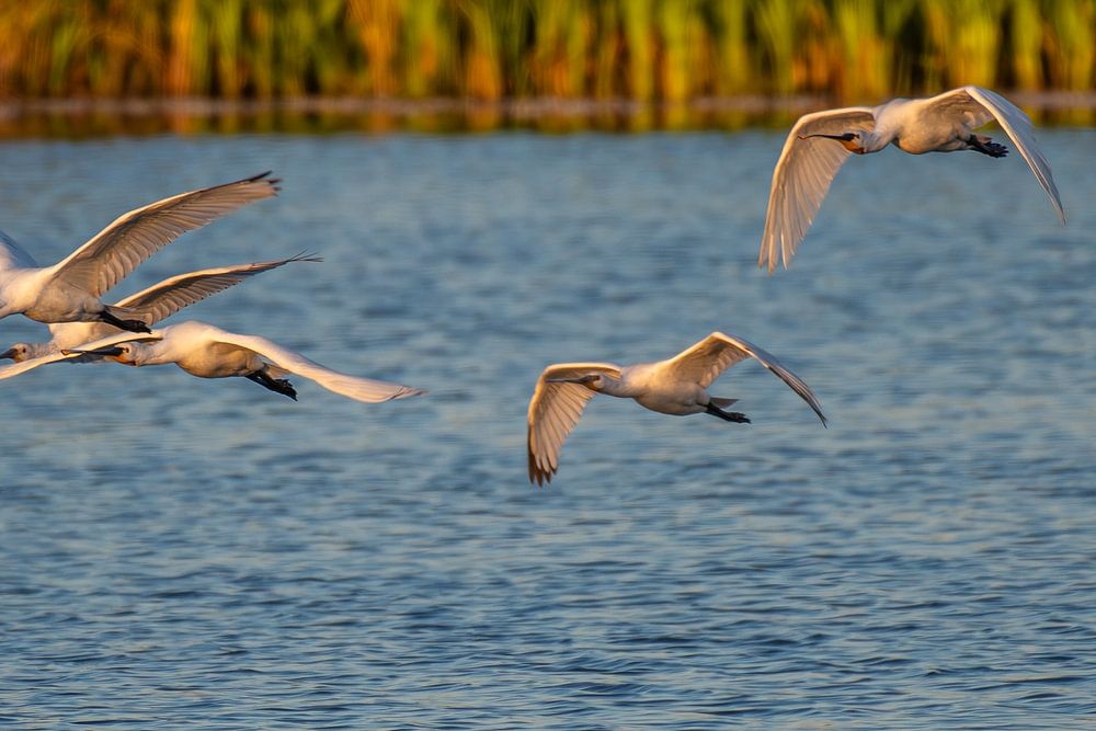 Spatules volant au-dessus de l'eau dans la lumière de la fin de soirée.