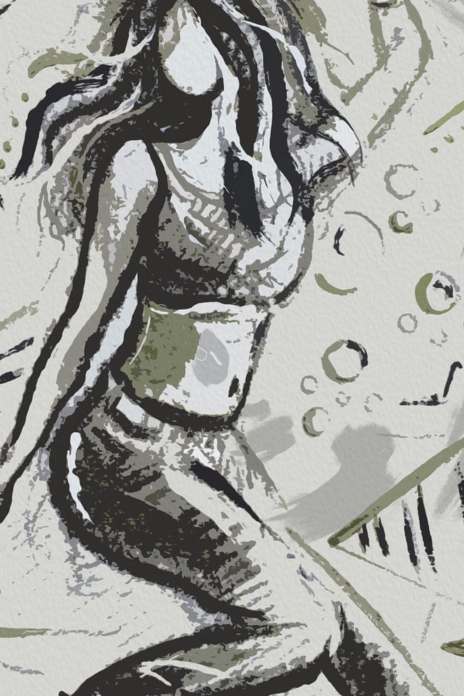 Cette jeune femme fait des mouvements de balancement. Cette œuvre semi-abstraite est une adaptation numérique d'un dessin au fusain. La simplicité de la palette de couleurs offre un contraste intéressant avec le dynamisme de la danseuse. Cette œuvre a été réalisée avec du gris-vert et du noir.
