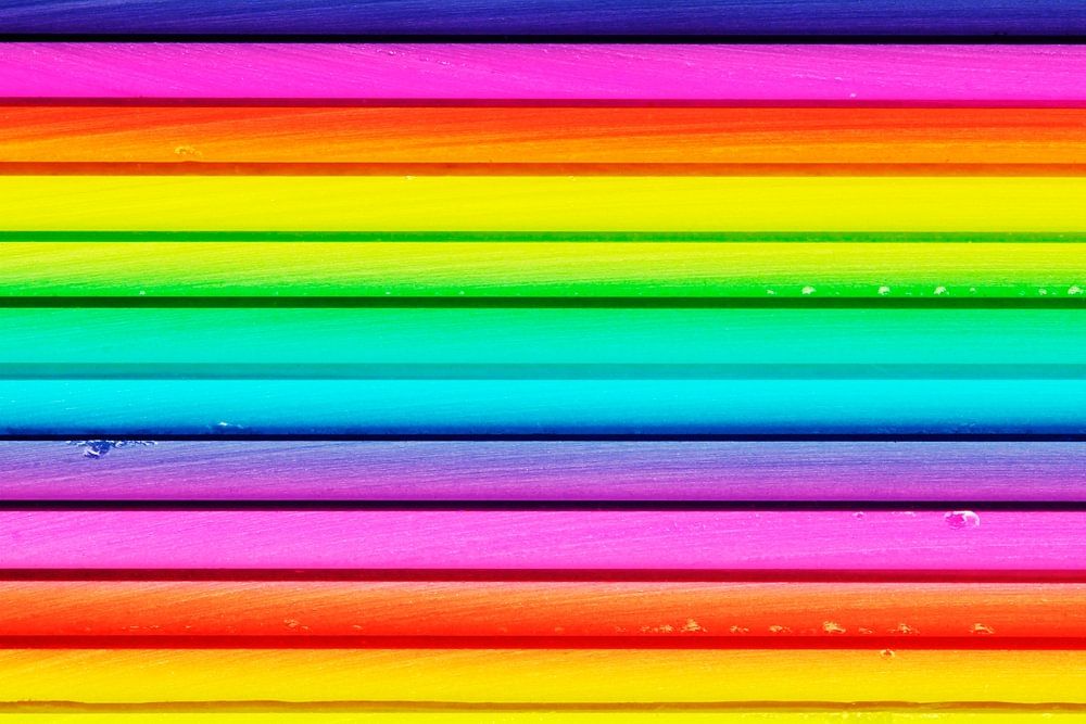 Une pile de lames de verre pour la microscopie en vue latérale comme image macro. Le spectre des couleurs visibles est représenté par les couleurs de l'arc-en-ciel.