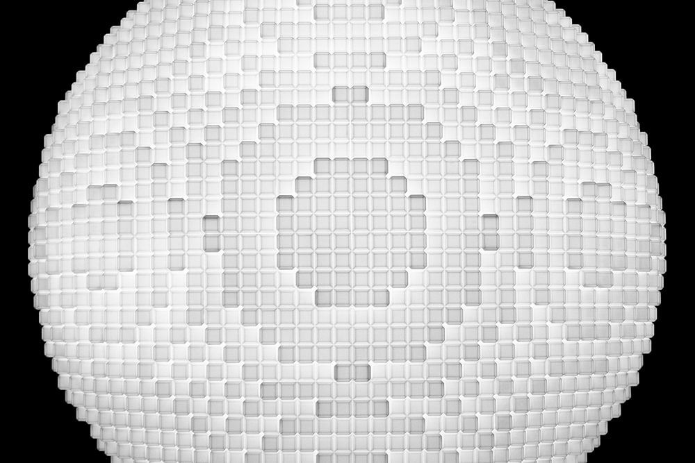 Une sphère blanche de cubes blancs sur un fond noir uniforme. On dirait presque une étoile de la mort blanche.