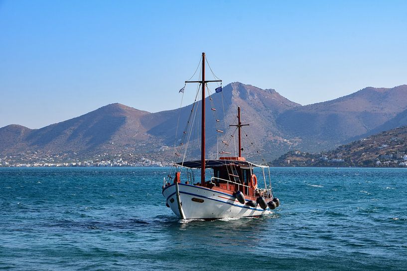 Un petit ferry arrive sur l'île de Spinalonga, sur la côte de Crète, en Grèce.