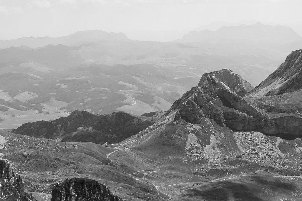 En utilisant une spirale, vos yeux sont attirés par une montagne fascinante. Tourné dans le parc national de Durmitor au Monténégro.