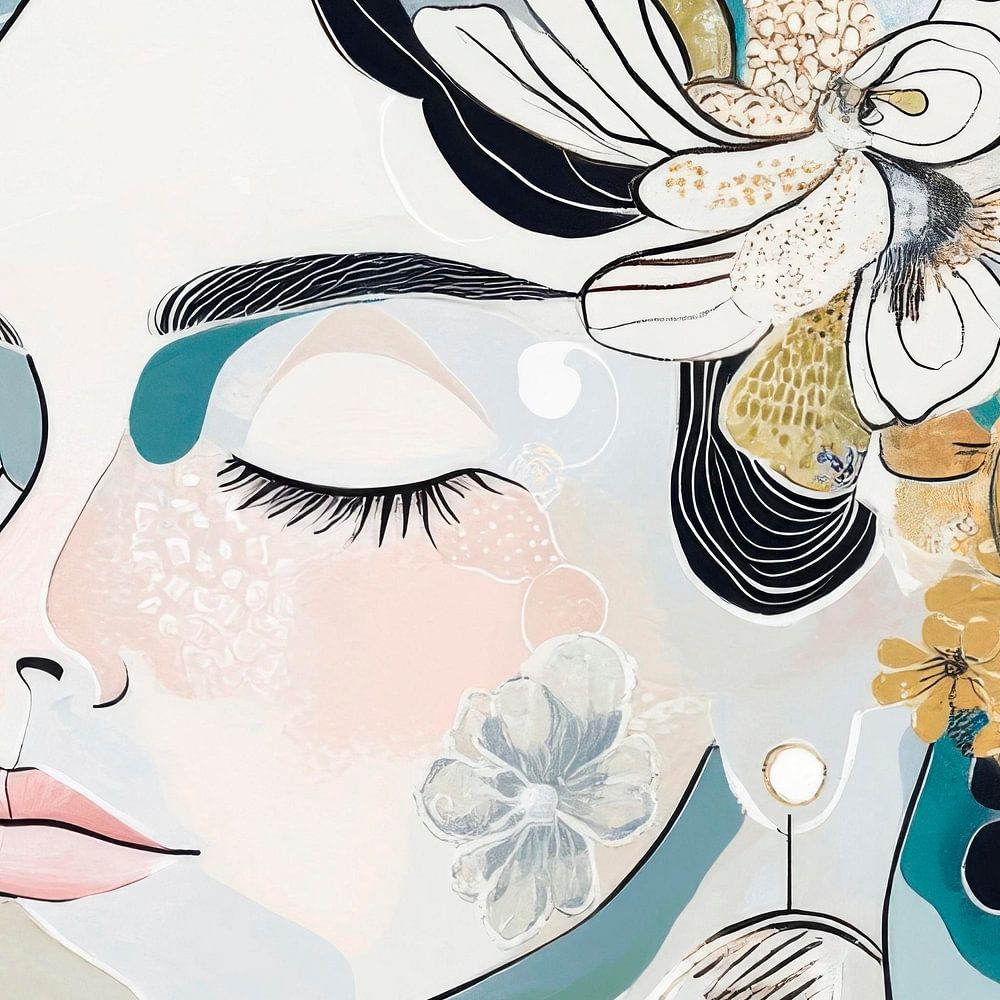 Une beauté rêveuse scintille dans un rêve de couleurs douces et de motifs floraux. Ses yeux fermés dégagent une paix intérieure, tandis que de somptueuses couronnes de fleurs ornent sa tête. Ses boucles d'oreilles artistiques et son visage délicat lui confèrent une élégance intemporelle, invitant l'âme à s'envoler et célébrant la nature.