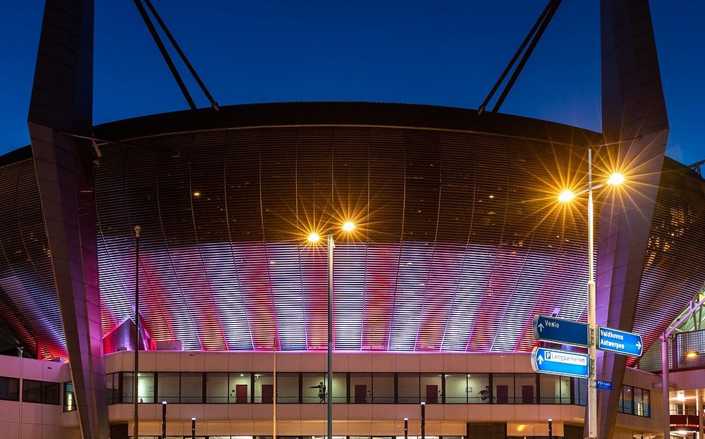 Photo du soir du stade Philips à Eindhoven. Pendant les heures de pointe, les couleurs du club PSV sont projetées sur la façade.
