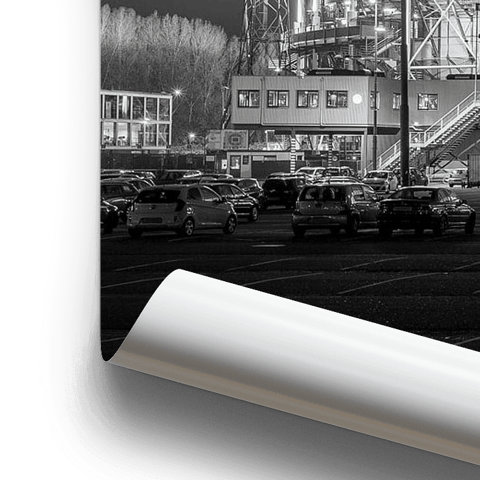 Cette photo en noir et blanc du stade de Kuip a été prise près du stade un soir d'octobre 2017. De Kuip est le domicile du club de football de Rotterdam du quartier de Feijenoord. Les pylônes du stade étaient illuminés ce soir-là, ce qui rendait la photo encore…