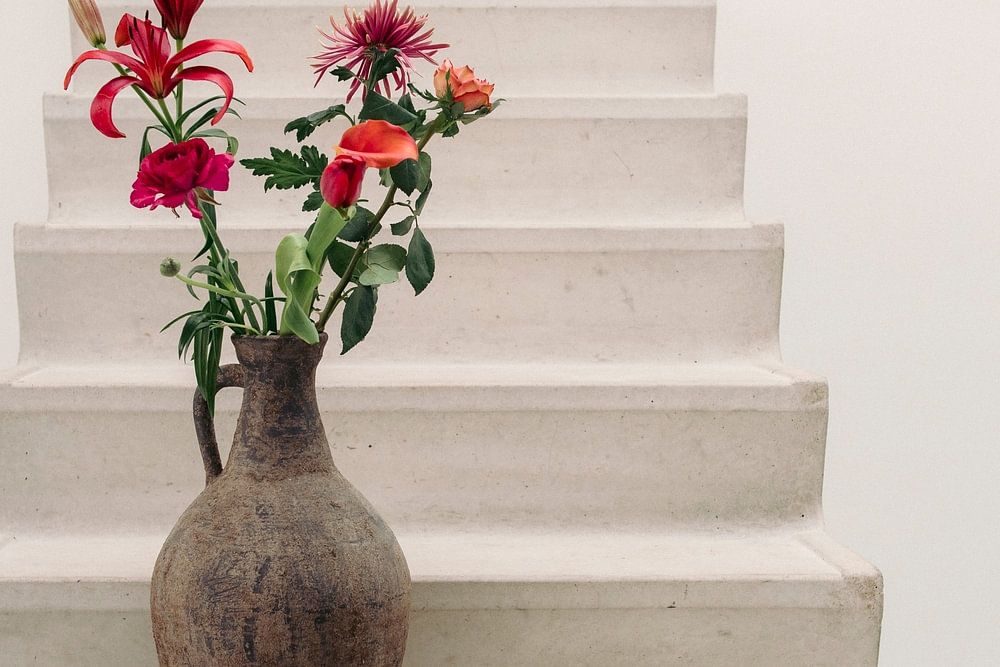 L'escalier du silence. Les tons clairs du blanc et du béton pur soulignent la simplicité. L'escalier est robuste et présente des lignes épurées dans la pièce. En même temps, la carafe avec des fleurs dans des tons de rouge fait une déclaration dans le silence.