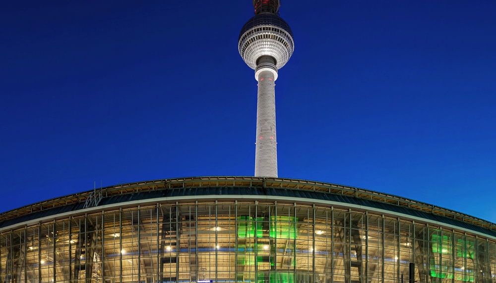 La gare sur l'alexanderplatz de Berlin et, derrière, la tour de télévision, emblème de la ville