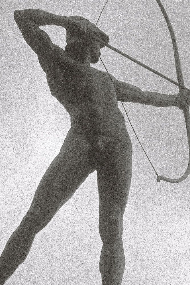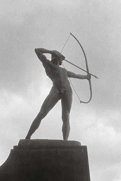 La statue d'"Der Bogenschütze", à Dresde, sur les rives de l'Elbe, en contrebas de la roseraie. Appareil photo FED 1 b avec objectif Leitz Elmar 50/3,5 (1937), film analogique Ilford HP5 Plus (ISO 400). Numérisation directe à partir du négatif avec grain de film clairement visible.