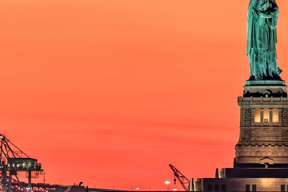 La vue du centre-ville de Manhattan sur Lady Liberty dans le port de New York au coucher du soleil.