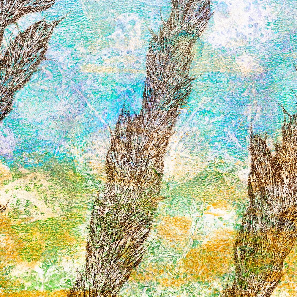 Ce monotype est réalisé avec une plaque de gelli et de la peinture acrylique. Il s'agit d'une œuvre unique et ponctuelle, dont le dessin ne peut être imprimé qu'une seule fois. Grâce à la technique d'impression graphique et au papier utilisé, toutes sortes de structures et d'effets sont créés. Les couleurs bleu, jaune ocre, brun et vert suggèrent un paysage. Un poesta, une prairie ou une steppe avec des herbes sauvages.