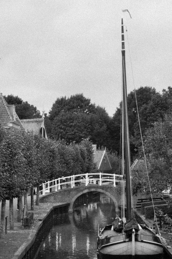 Platbodem zeilboot in een grachtje. Oud Hollandsche stilleven