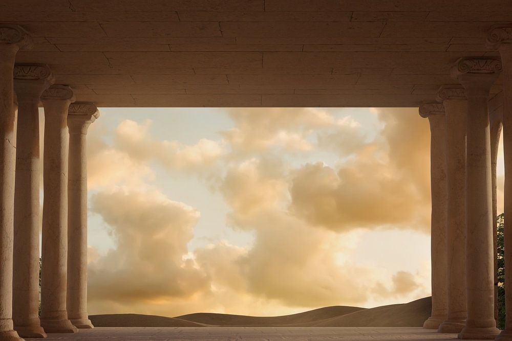 Achetez cette œuvre d'art de paysage Stoa antique avec colonnes ioniques et vue sur le paysage de nuages par Besart Beluli sur toile, aluminium, ArtFrame ou photographie (encadrée), impression d'art en haute qualité et tout format.