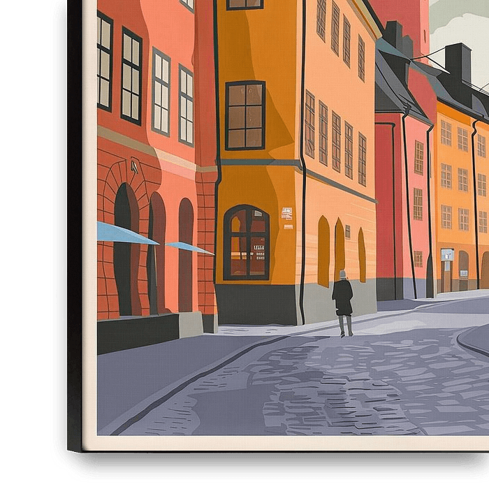 Un coin de ville pittoresque se déploie, où les couleurs chaudes des façades créent une atmosphère accueillante. En arrière-plan, un fier clocher d'église s'élance vers le ciel, tandis que de doux nuages soulignent le bleu limpide du ciel. Les ruelles étroites invitent à explorer la beauté charmante de Stockholm et à découvrir des…
