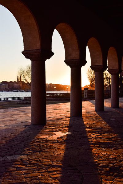Le soleil couchant d'hiver projette de longues ombres derrière les colonnes de l'hôtel de ville de Stockholm et baigne la capitale suédoise d'une lumière dorée.